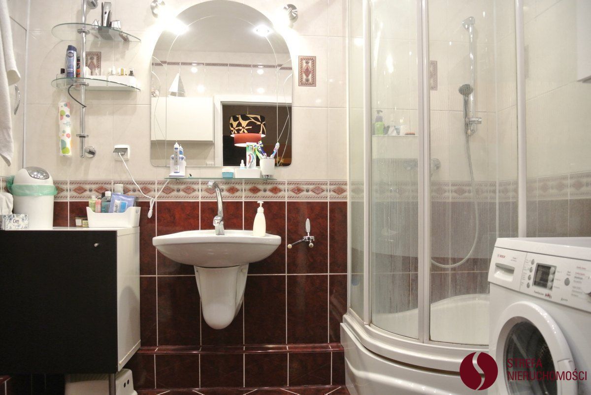 - Funkcjonalna łazienka z prysznicem, toaletą, umywalką i pralką.